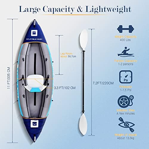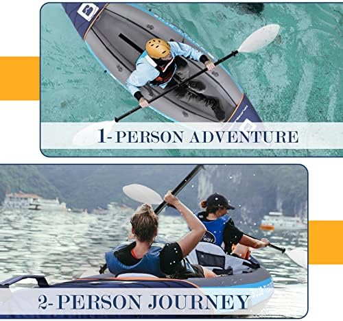 LIGHTWEIGHT & EASY TO CARRY- The kayak only weighs about 13.3kg, which can be carried easily by one person. The backpack only measures 26.6’’ x 26’’ x 11.5’’, which allows the kayak and all accessories to fit in easily