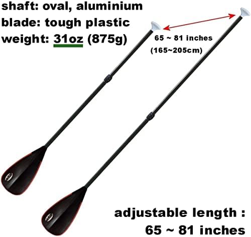 OVAL SHAFT - will not twist like a cheaper round shaft aluminum paddle ! TOUGH plastic blade - will not shatter or break like fiberglass / carbon in rocky rivers TOTAL WEIGHT : 31 oz (875g ) ADJUSTABLE TOTAL LENGTH : 65 - 81 inches (165 - 205 cm) 6 MONTH WARRANTY ! (returns are rare, but if you need to, we have a service depot in Denver, CO)