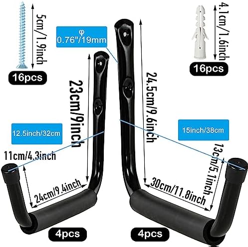 Two Sizes: Come with 8 pack 2 different style utility wall mount hooks with 16pcs screws and 16pcs anchors, The long ladder hooks inner size is: 11.8 inch x 9.6 inch (H x W), the diameter of the steel tube is 0.76inch/1.9cm, total long is 15inch/38cm. The short ladder hooks inner size is: 9.4 inch x 9 inch (H x W), the diameter of the steel tube is 0.76inch/1.9cm, total long is 12.5inch/32cm. With thick EVA protector design to protect your hang things from being crushed.
