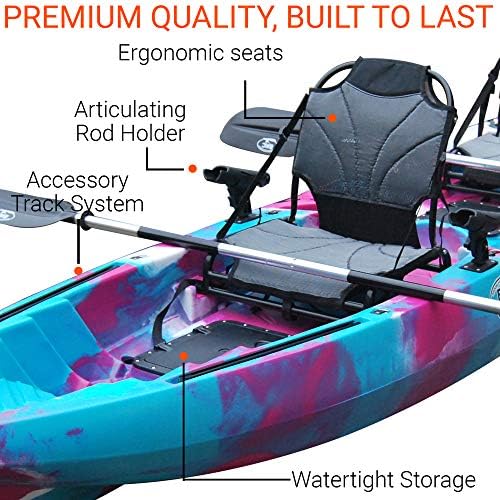 FULLY LOADED ACCESSORIES: Our kayak comes equipped with 2 ergonomic aluminum frame seats, 2 adjustable aluminum paddles, 2 waterproof hatches, 4 built in rod holders, 2 paddle parks, and 1 bungee cargo tie down. We have all the accessories you need for your next excursion.
