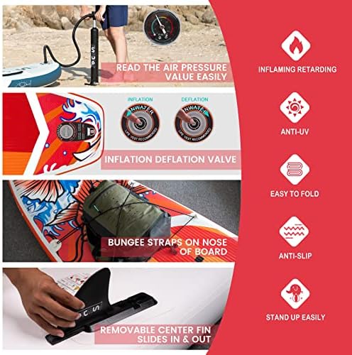 【Design and Use】Funwater's unique ergonomic handle design allows you to inflate your paddle more easily in a shorter time. The sensitive barometer ensures that you can read the sup inflation pressure value (12-15psi) at any time. The multifunctional elastic string can tightly fix any objects placed on the inflatable paddleboard. The multipurpose and ultra-large backpack can help you easily carry the paddle to any of your dream places.