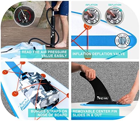 【Design and Use】 Funwater's unique ergonomic handle design allows you to inflate your paddle more easily in a shorter time. The sensitive barometer ensures that you can read the sup inflation pressure value (12-15psi) at any time. The multifunctional elastic string can tightly fix any objects placed on the inflatable paddleboard. The multipurpose and ultra-large backpack can help you easily carry the paddle to any of your dream places.