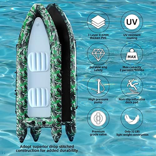 【High Quality Material】Our inflatable dinghy boats are made of 3 layers of 0.6mm thick PVC material with good tear and break resistance. There are grab rope lines all around to do safety protection, and the V-shaped air chamber design greatly reduces the resistance of water, not easy to capsize.