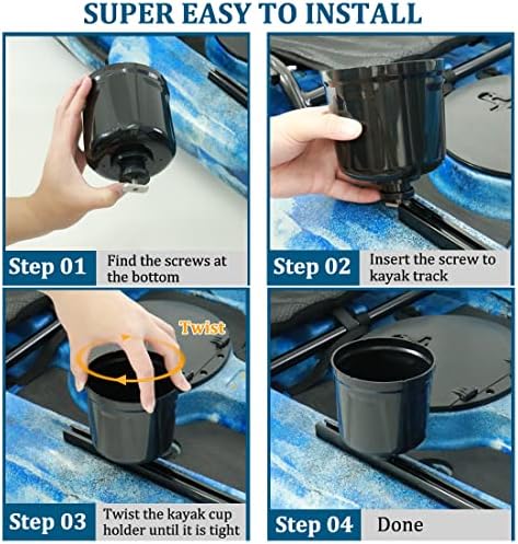 【SUPER EASY TO INSTALL ON KAYAK TRACK】No more drilling or srews, almost "plug and play" feature. Installation and removal is a breeze. Just insert gear track stud into gear track, slide to desired position, twist cup holder until rubber grommet is tight on the rail.