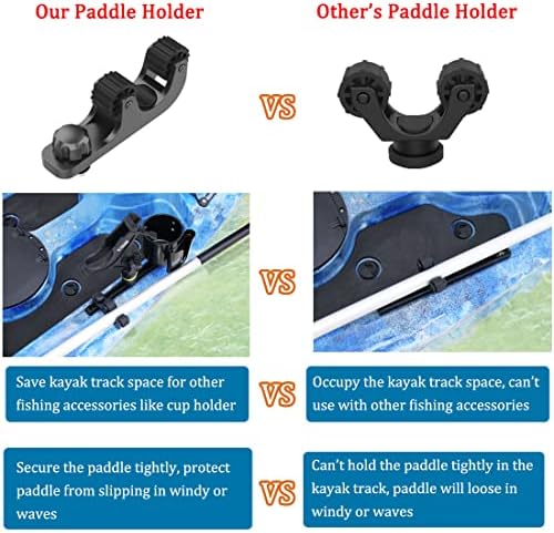 【COMPARE TO OTHER KAYAK TRACK PADDLE HOLDER】 This kayak paddle allows you to place the paddle on the outside of the kayak saving rail space for other stuff like kayak track fishing rod holder. What's more, other's paddle holder doesn’t hold the paddle tightly enough and you will easily lose your paddle, but our paddle holder can keep the paddle tightly and securely.