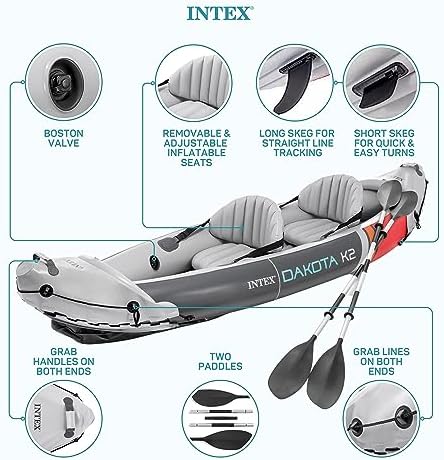 Includes: Inflatable seats with backrests that are removable and adjustable; Includes 2 dry bags and a carry bag for carrying the kayak and accessories when not in use