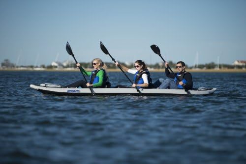 18 D-rings to secure seats for one or two person use, Bow/Stern Grab Handles, Front and Rear Spray Skirts with storage and lacing