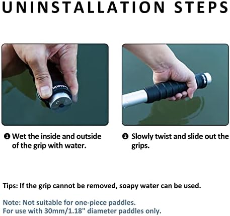 【EASY TO INSTALL & UNINSTALL】: Install: 1.Let the water fully wet the grip. 2.Put wet grips on both ends of the paddle. 3.Pat the end of the grip by hand. 4.Push the grip to the appropriate position. Uninstall: 1.Wet the inside and outside of the grip with water. 7.Slowly move the handle out.