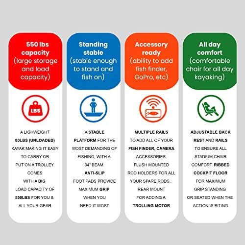 EASY TO MOVE: This professional fishing kayak weighs only 80lbs (unloaded) making it easy to get onto the included kayak trolley and be at your secret fishing spot in no time. It has an incredible 550lbs load capacity, to take your family and all your essential gear no matter what’s biting.
