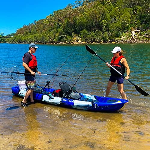 LOADED WITH FEATURES: The stable "W" hull shape for either seated or standing action, a large cockpit with 3 secure storage hatches for even the roughest conditions, 2 adjustable aluminium paddles, 2 seat backpacks to store your extra gear, 4 track rails for mounting fishing rods holders and accessories, 6 rod holders and of course, an anchor trolley to get the best fishing position..