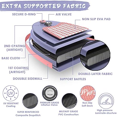 【PREMIUM MATERIALS】Our boards are made of the highest quality military grade materials. Ultralight double wall PVC is 25% lighter than other same size products. Meanwhile, this reinforced lightweight fabric creates a firmness, anti-corrosion, wear-resistance sup board which can be used for years. Soft non-slip EVA deck pad makes you feel comfortable while ensuring your stability and safety when you stand for a long time. UPWELL paddle board is your optimal choice for water sports.